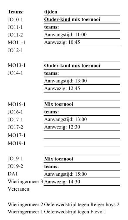 Voor deze 21 augustus hebben we de onderstaande toernooien geplant staat. Voor de jongste jeugd zullen we een ouder-kind mix toernooi maken, gezellig samen met pappa of mamma op het veld! Voor de andere teams hebben we mooie mixen gemaakt om onderling een gezellige voetbalmiddag te hebben! We gaan ervan uit dat iedereen er is maar mocht jij of (bij de jongste jeugd – de ouders) verhinderd zijn, doe dan tijdig afbericht bij je eigen coach/trainer! En om de energie na de welverdiende vakantie weer wat op te krikken, zullen we rond de middag er ook voor zorgen dat er een versnapering aanwezig is in de vorm van een poffertjeskraam!